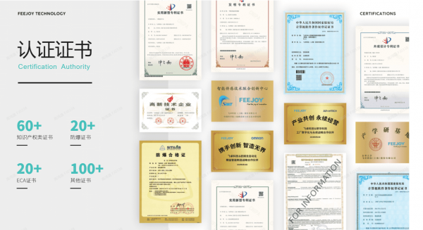 飞卓科技建立了完善的质量管理体系,产品通过防爆认证、CE、EAC、PAC、CPA认证。公司所生产的仪器仪表产品具有高精度、高稳定性特点,可定制适应不同温度环境,稳定工作,可定制满足防爆场合使用要求。严格的工艺控制和材料选择确保了产品在各种工况下的可靠性。