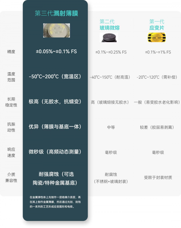 半导体先进制程对压力传感器的严苛需求(洁净度、稳定性、精度)驱动了技术代际演进:***代应变片受困于有机粘合剂失效与污染;第二代玻璃微熔虽有进步,但在极限要求下仍显不足;第三代溅射薄膜技术通过直接溅射成膜和先进工艺控制,实现了全方位的性能跃升,成为支撑未来晶圆制造的突破性解决方案。